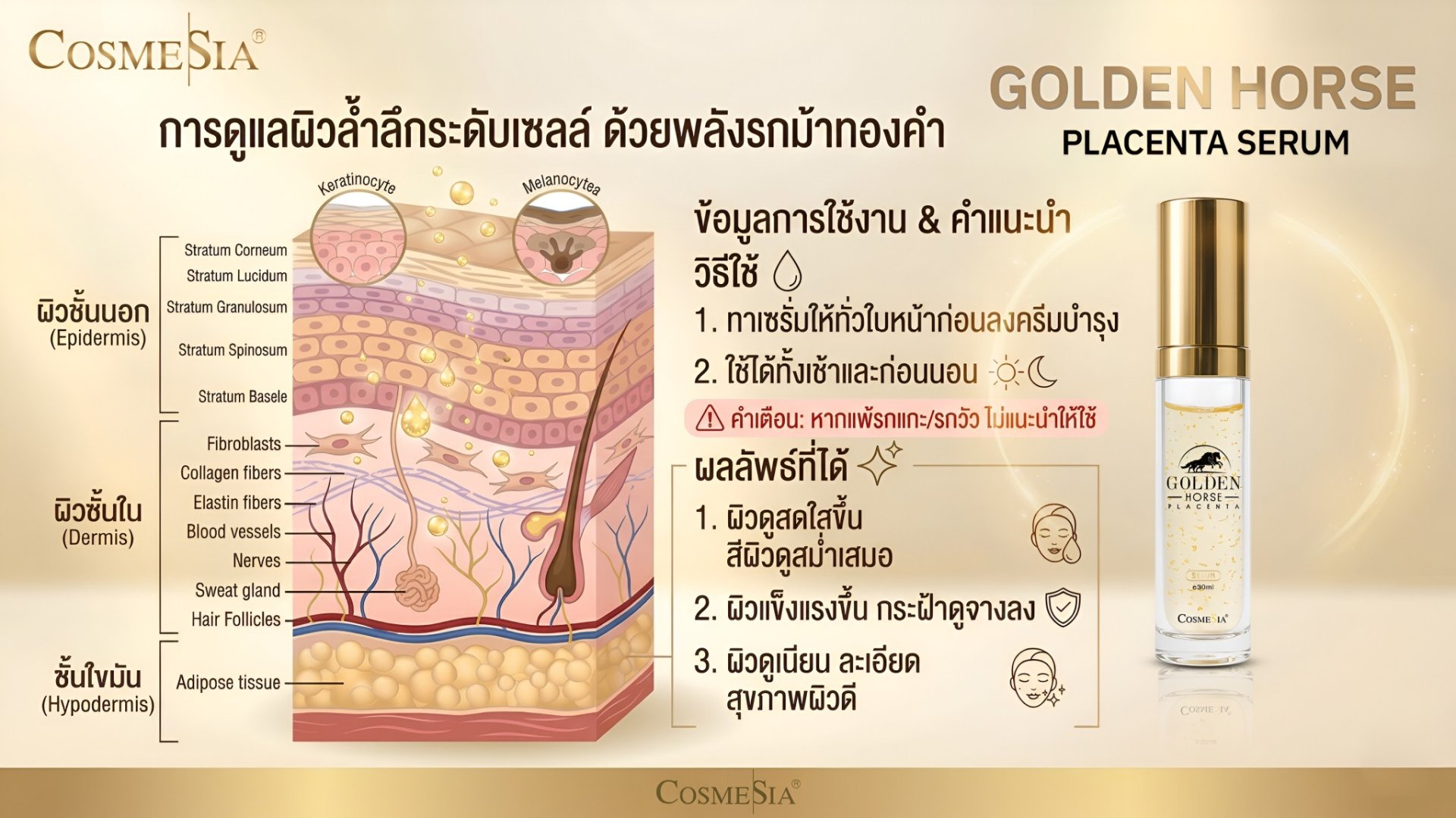 เซรั่มทองคำอันทรงคุณค่า แห่งการบำรุงผิวบริสุทธิ์ 99.99% ผสานด้วยสารสกัดรกม้าแข่งสายพันธุ์นิวซีแลนด์จากประเทศญี่ปุ่น ช่วยเพิ่มความชุ่มชื่นให้กับผิว ลดริ้วรอยแห่งวัย ช่วยให้ผิวแลดูเรียบเนียน กระชับ กระจ่างใสอย่างเป็นธรรมชาติ ปราศจาก สี น้ำหอม และ Paraben เหมาะกับทุกสภาพผิว