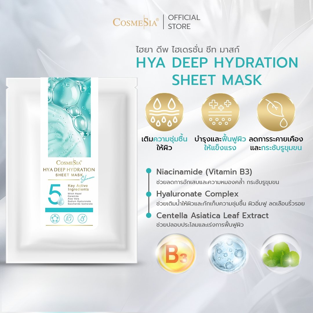 ฟื้นบำรุงผิวฉับพลันด้วยแผ่นมาสก์หน้าสูตรเข้มข้น อัดแน่นด้วย Hyaluronic Acid 12 ชนิด เพื่อผิวชุ่มชื้นถึงขีดสุด ผสาน Niacinamide และ ใบบัวบก ช่วยปลอบประโลมผิว ลดรอยแดง และเสริมเกราะป้องกันผิวให้แข็งแรง พร้อม Ceramide และ Witch Hazel ที่ช่วยกระชับผิวและรูขุมขน ให้ผิวอิ่มน้ำ เนียนนุ่ม กระจ่างใส ดูอ่อนเยาว์ในครั้งเดียว
