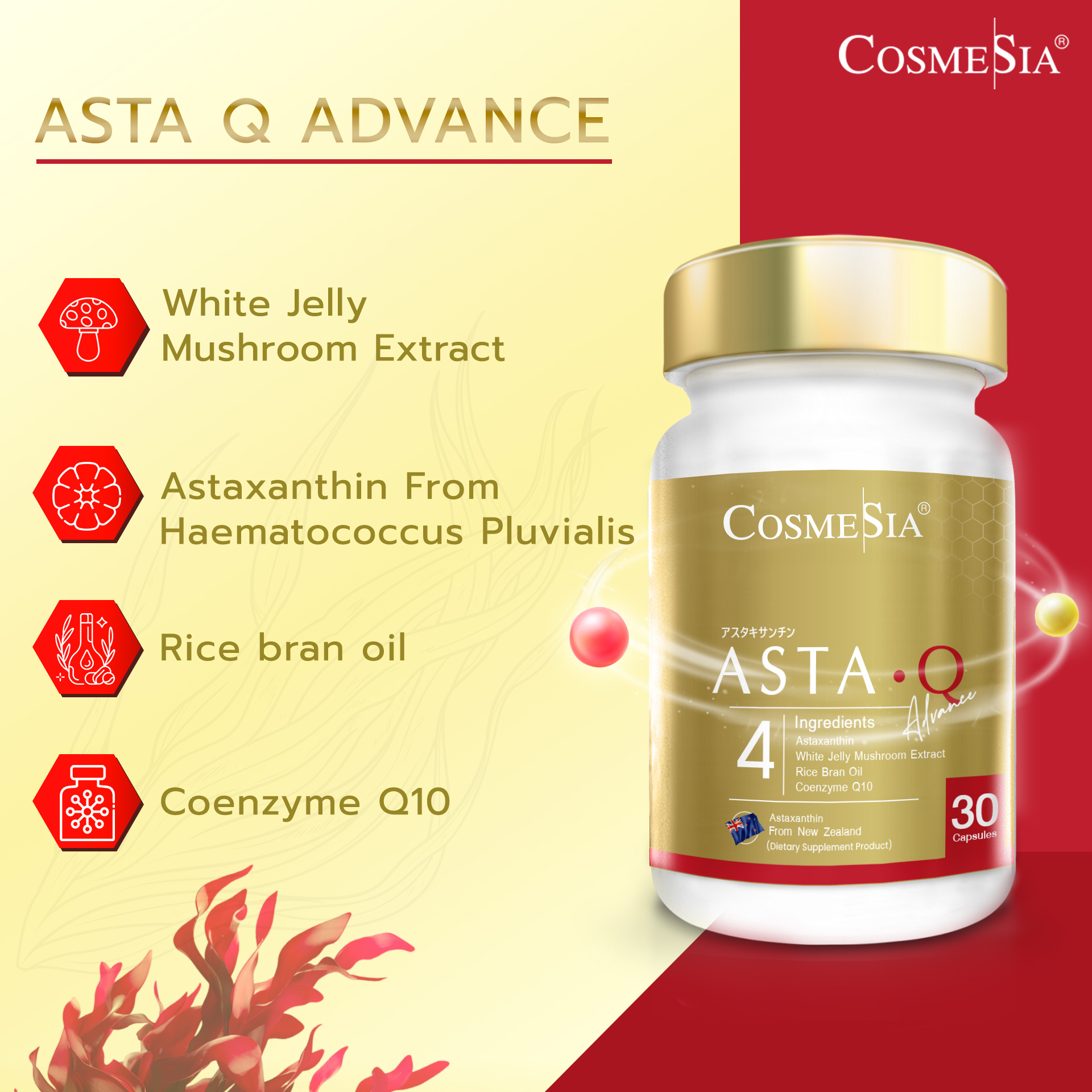 ต้านความชราด้วย Astaxanthin จากสาหร่ายสีแดง สุดยอดสารต้านอนุมูลอิสระ ผสาน Coenzyme Q10 และ น้ำมันรำข้าว บำรุงลึกถึงเซลล์ ช่วยลดเลือนริ้วรอย จุดด่างดำ พร้อม สารสกัดเห็ดหูหนูขาว เติมความชุ่มชื้นล้ำลึก ให้ผิวเนียนนุ่ม ยืดหยุ่น เปล่งปลั่ง สดใส อ่อนเยาว์จากภายใน